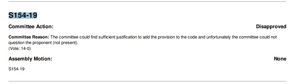 reasoning for the decision can be found on the same web page, https://www.iccsafe.org/products-and-services/i-codes/code-development-process/2019-group-b/.